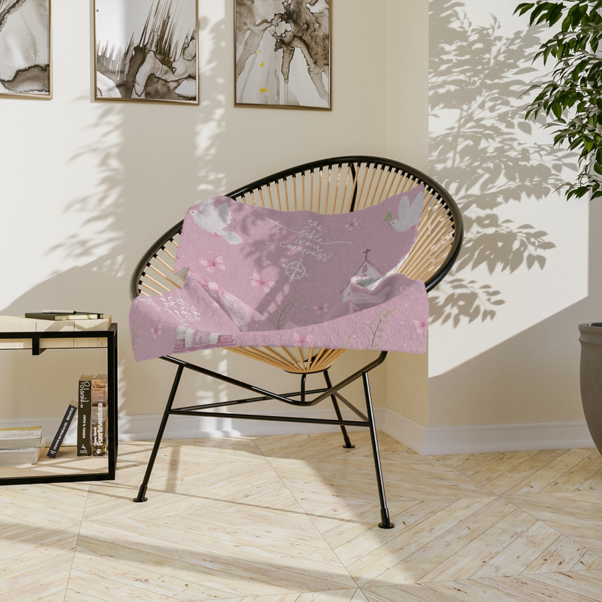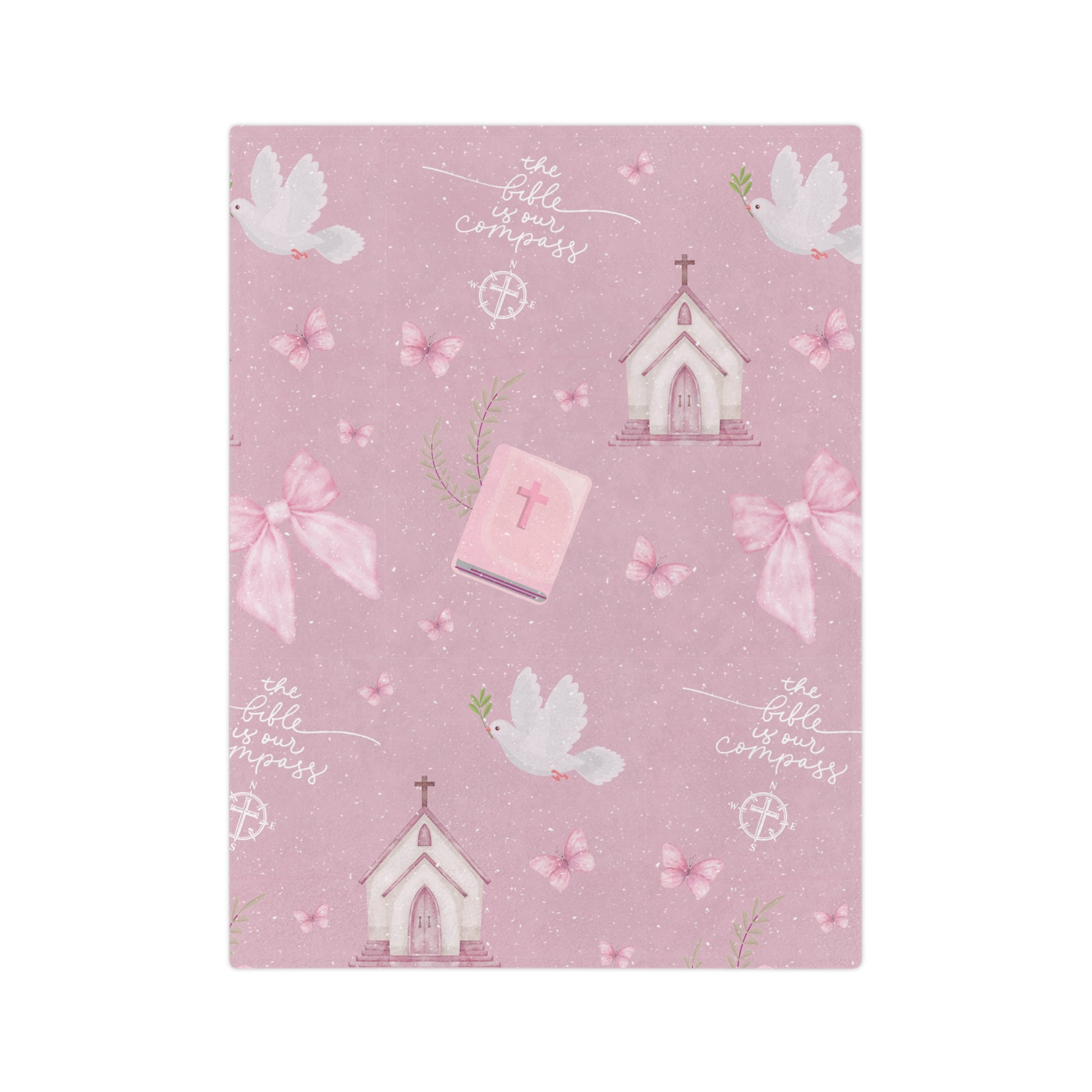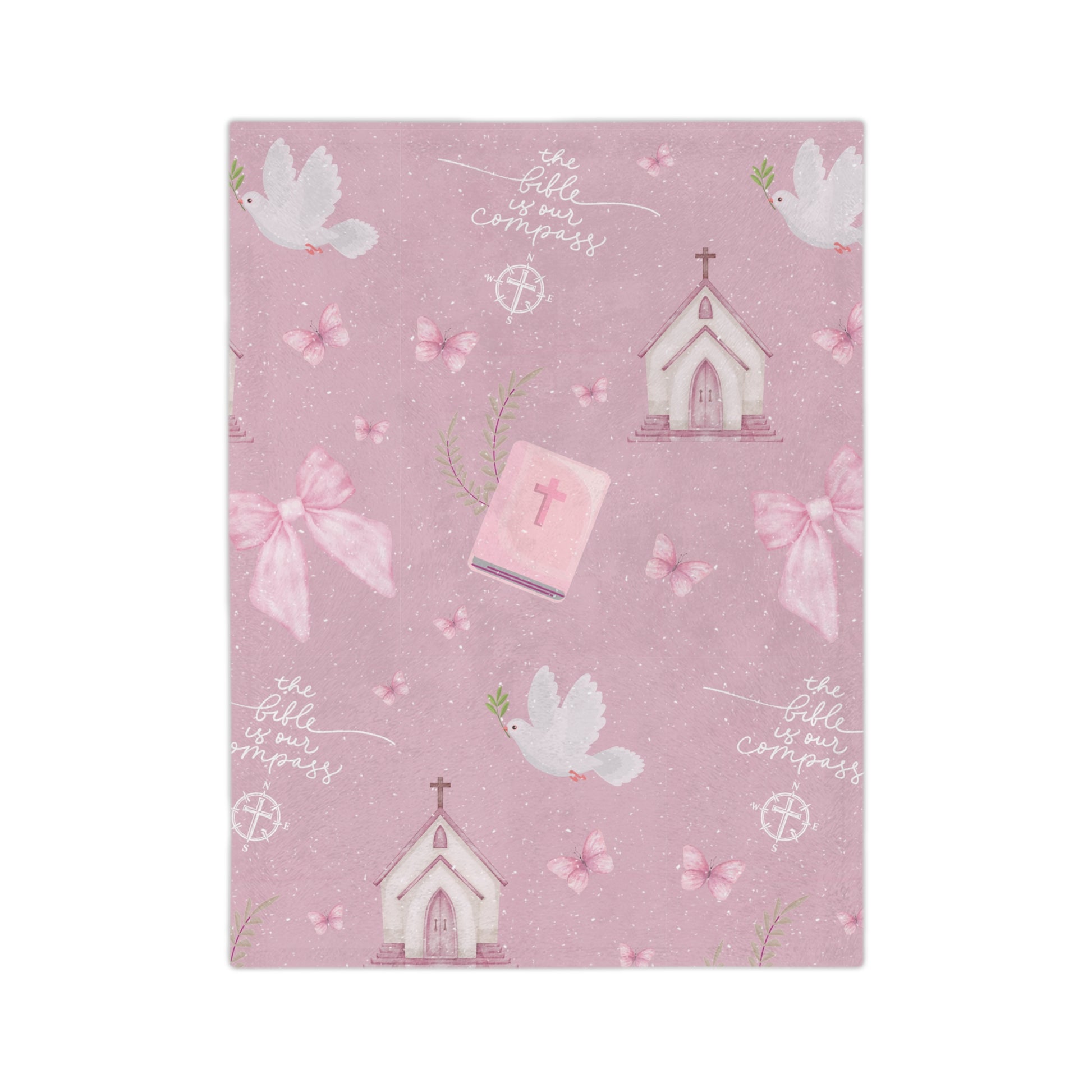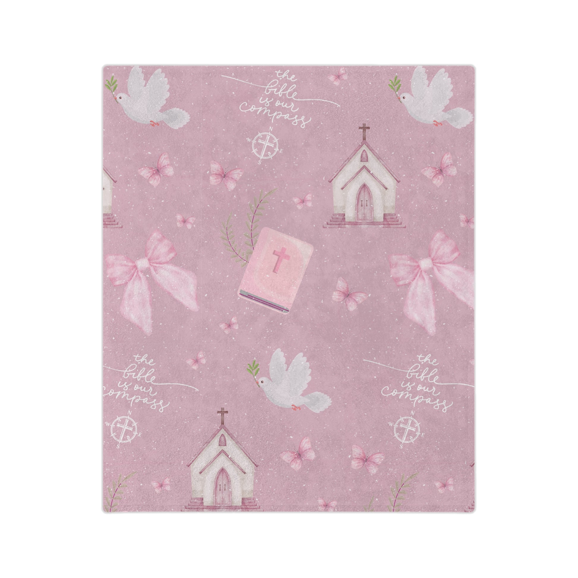Guide your little one with faith and love through our Bible Is Our Compass Blanket, inspired by Psalm 119:105 — “Your word is a lamp to my feet and a light to my path.” This soft and meaningful design features watercolor artwork of churches, doves, Bibles, bows, and butterflies — each element symbolizing God’s Word as our guiding light.