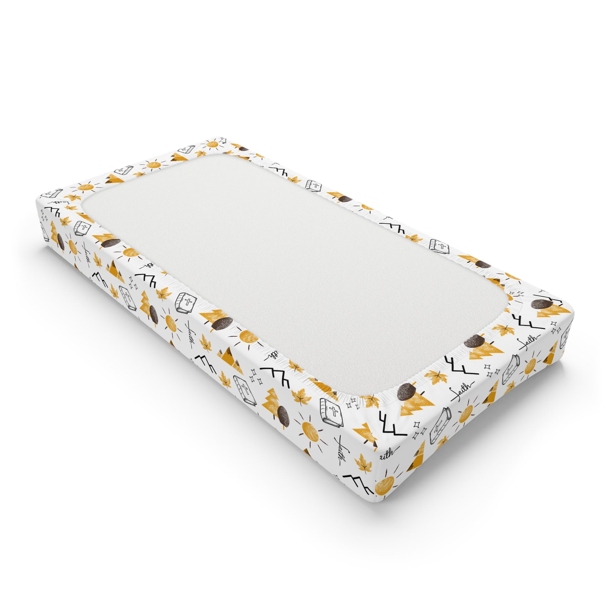 Bring inspiration and comfort into your nursery with our Faith Can Move Mountains Baby Changing Pad Cover. Featuring a playful yet modern Christian design with Bibles, crosses, sunshine, trees, and autumn leaves, this cover is a beautiful reminder of Matthew 17:20—that even the smallest faith can move mountains.