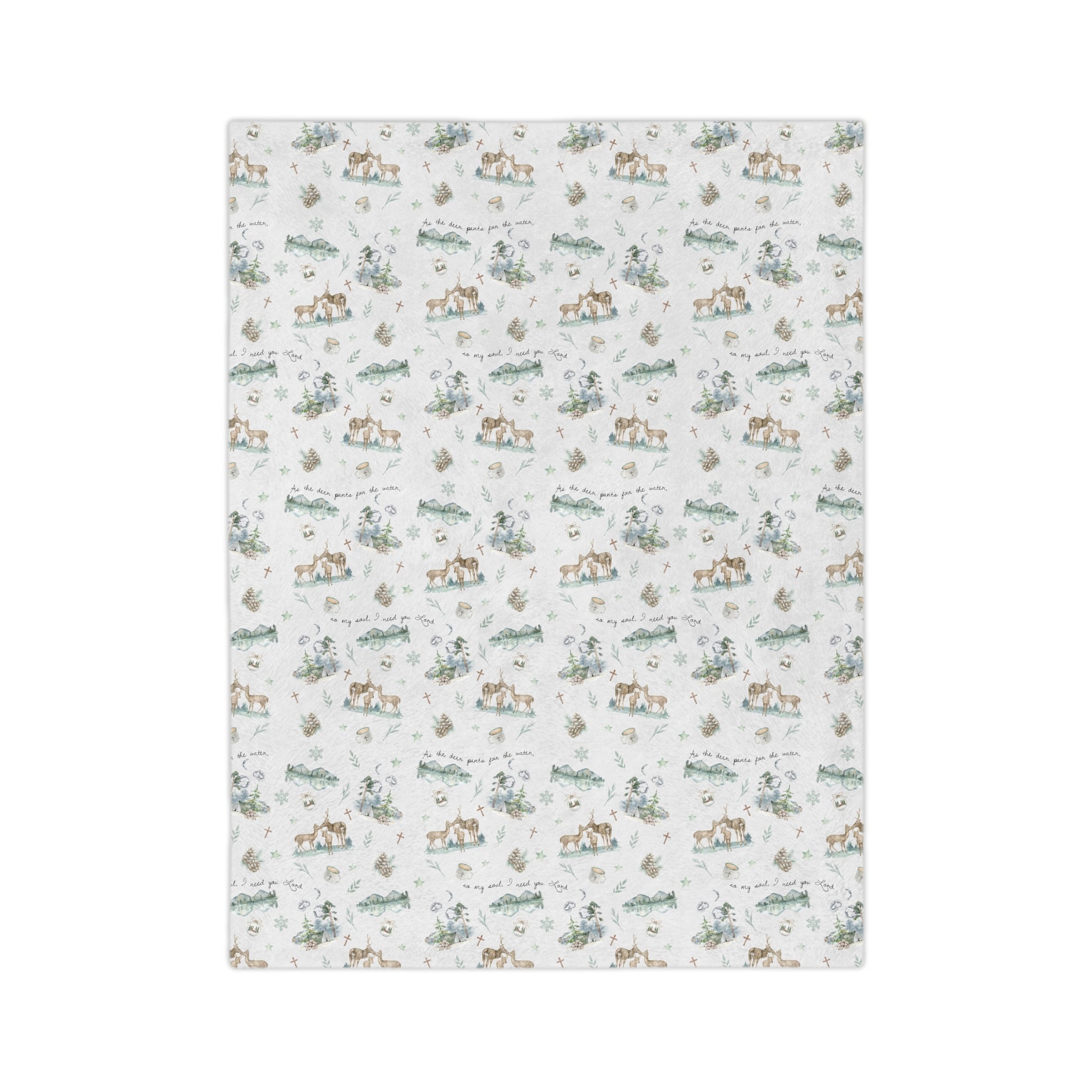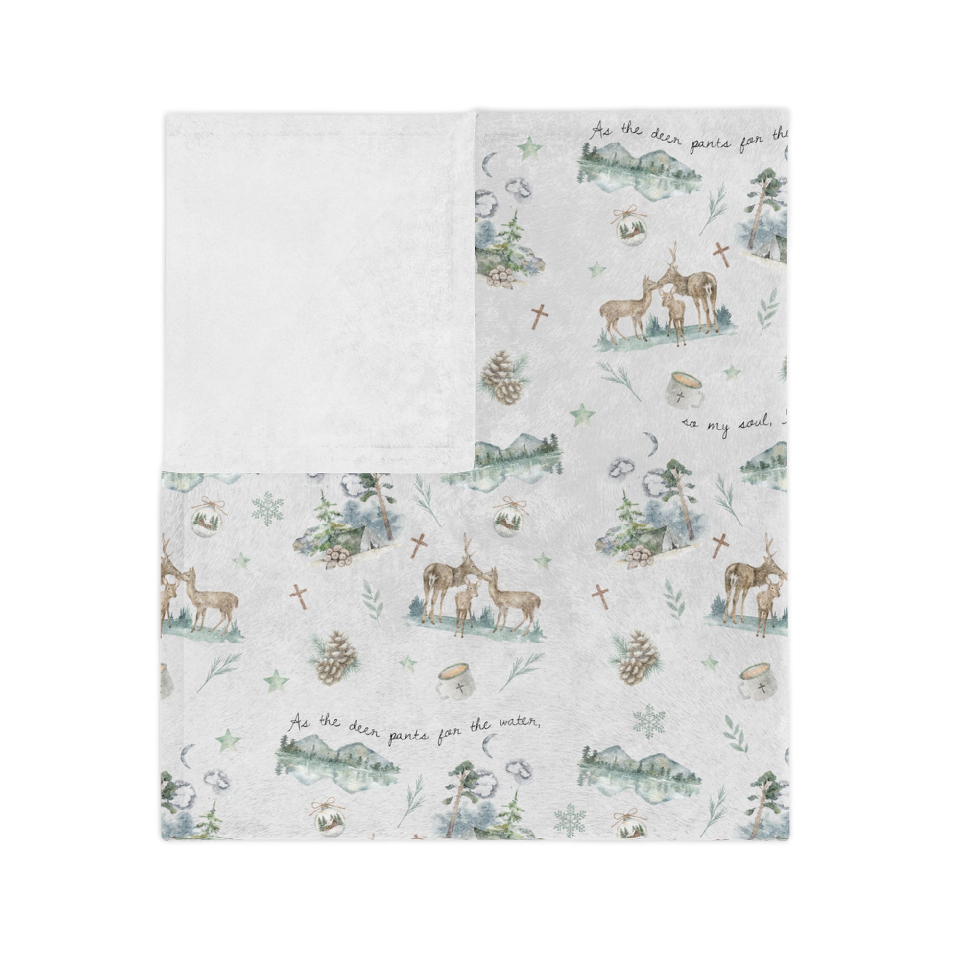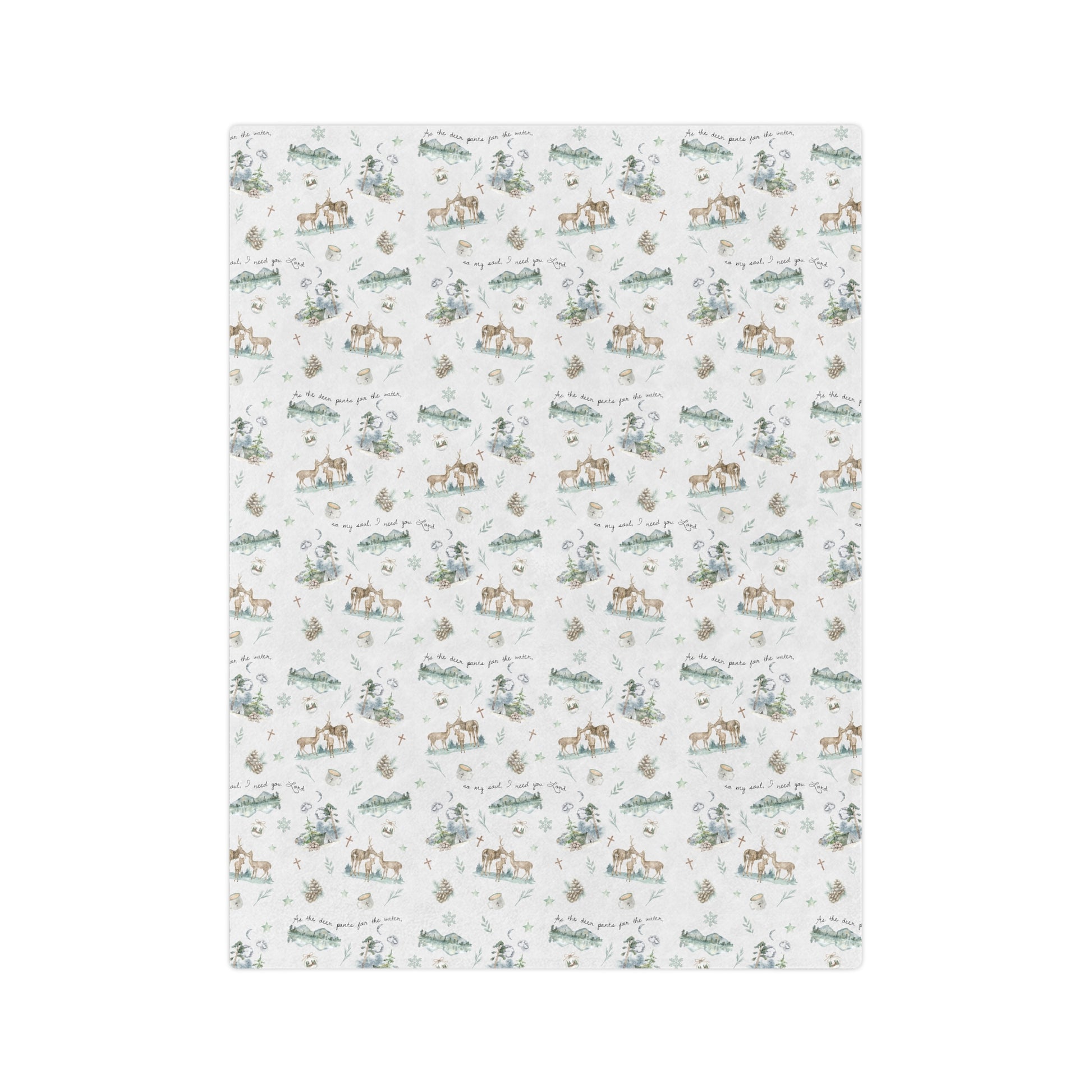 This gentle woodland-themed blanket is a reminder of the deep longing our hearts have for the presence of God — a longing He faithfully meets with comfort, peace, and rest. Featuring soft watercolor deer, evergreen landscapes, pinecones, and quiet winter greenery, this design creates a calming atmosphere for both nurseries and cozy family spaces.