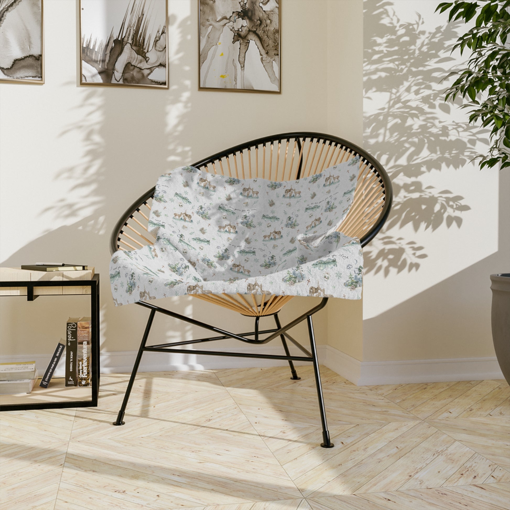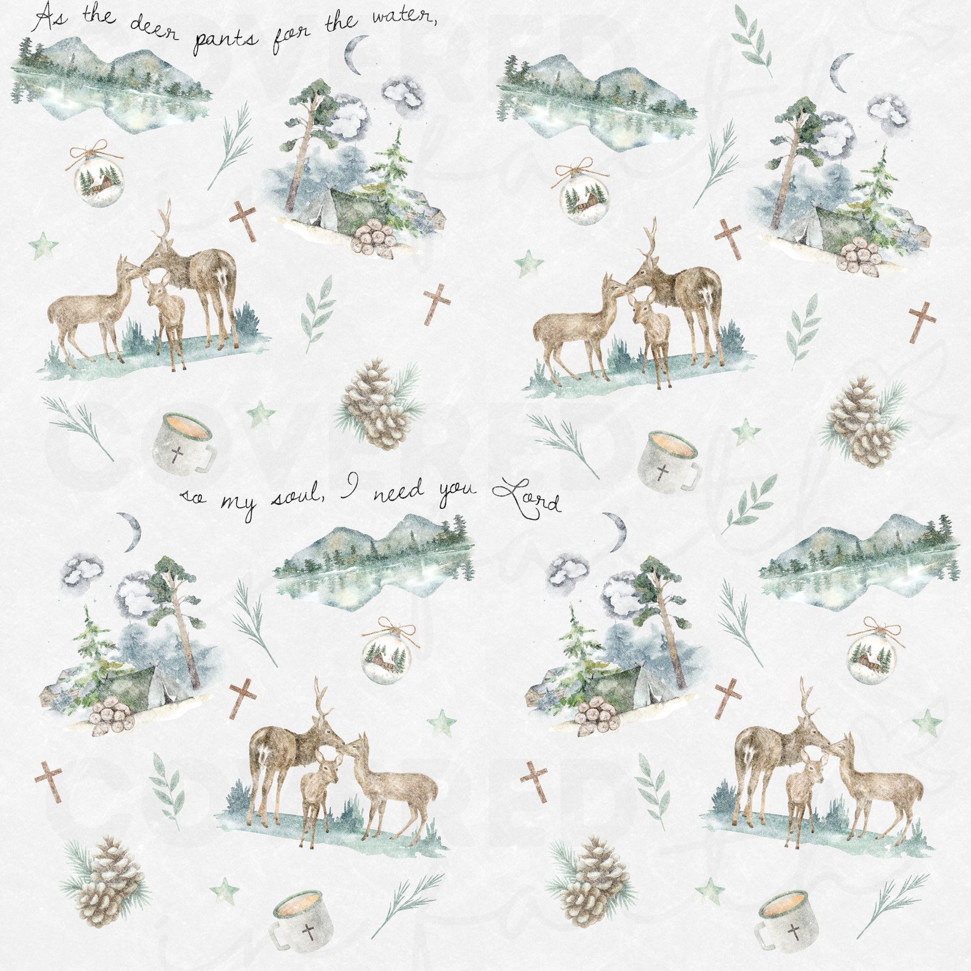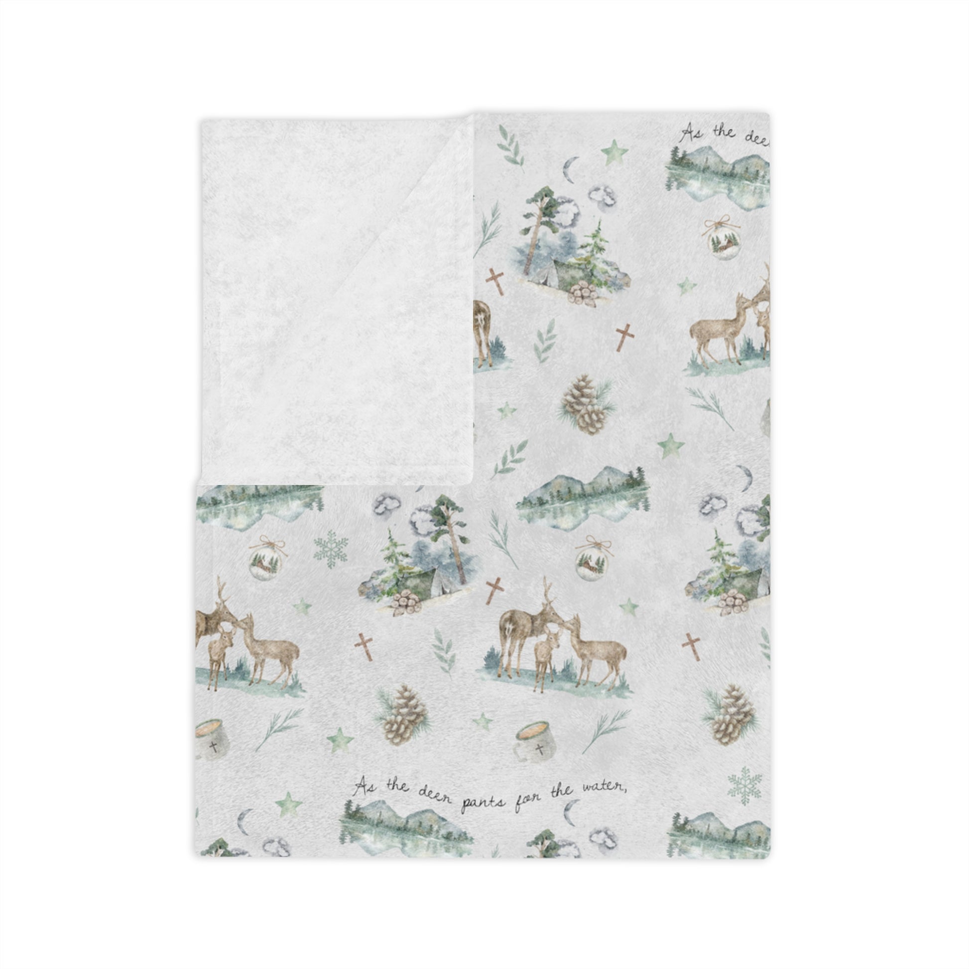 This gentle woodland-themed blanket is a reminder of the deep longing our hearts have for the presence of God — a longing He faithfully meets with comfort, peace, and rest. Featuring soft watercolor deer, evergreen landscapes, pinecones, and quiet winter greenery, this design creates a calming atmosphere for both nurseries and cozy family spaces.